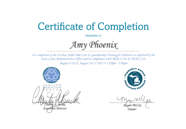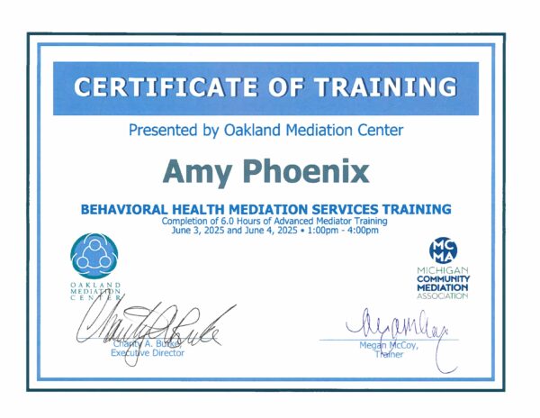 My approach is grounded in the Michigan Mediator Standards of Conduct ensuring a respectful, ethical and thorough mediation experience. Alongside my mediation training, I draw from a broad background in community‑based problem solving, facilitation, and support work, which strengthens my ability to help people communicate clearly and work toward sustainable solutions.